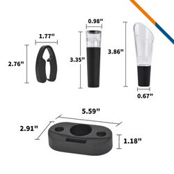 Product size: 7.28" H x 2.36" W x 1.69" D (Wine opener), 3.35" H x 0.98" W (Wine Stopper), 2.76" H x 1.77" W (Foil Cutter), 3.86" H x 0.67" W (Wine Pourer), 5.59" W x 2.91" D x 1.18" H (Base)