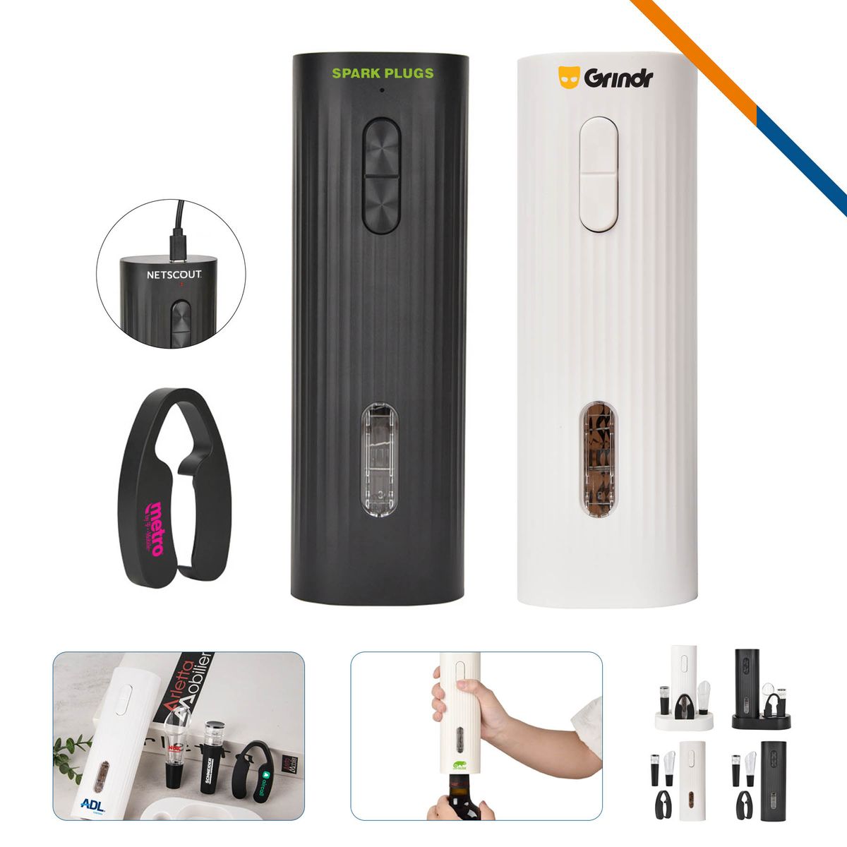 Make your brand unforgettable with VinoKey Electric Wine Opener Set, Crafted with ABS plastic and PC material, this wine opener set is durable. The electric wine opener can open wine bottles conveniently and effortlessly. There are 3 styles to choose from. Two-piece set comes with an electric wine opener and a foil cutter. Four-piece set has an electric wine opener, a foil cutter, a wine stopper, and a wine pourer. Five-piece set includes an electric wine opener, a foil cutter, a wine stopper, a wine pourer, and a base. Powered by 500mAh battery, the wine opener can be recharged via Type-C port (charging cable included). Perfect tool to use at parties, birthday and other celebratory events. Standard with Two-piece set. Premium with four-piece set or five-piece set are available at additional charge.